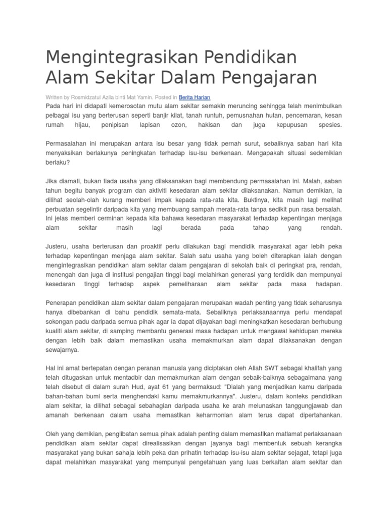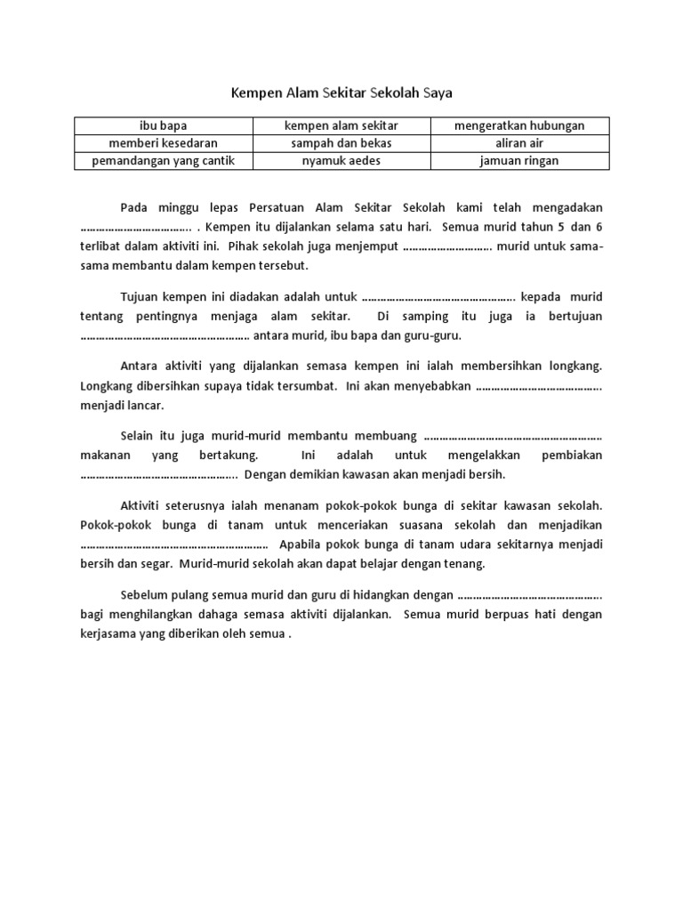 Alam sekitar terus tercemar oleh pelbagai aktiviti manusia yang tidak terkawal. Setiap rabu kebiasaannya murid akan mengikut pelbagai aktiviti kokurikulum sama ada aktiviti unit beruniform sukan permainan ataupun kelab persatuan yang dianjurkan oleh pihak sekolah. Guru perlu pra-mengarang persembahan teladan.
